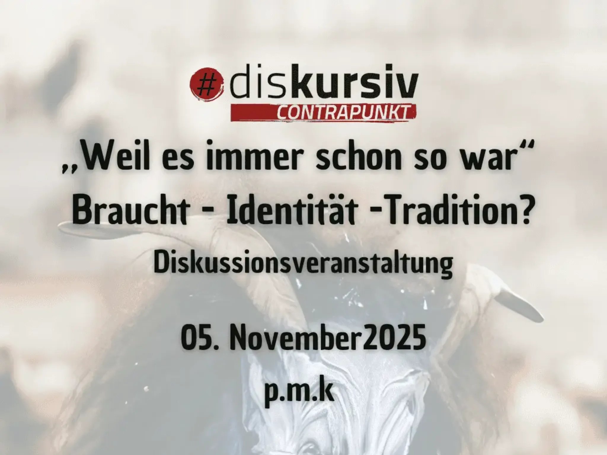As the ContrApunkt cultural collective, we invite you to p.m.k on 05.11.2025 to take a critical look at the terms "tradition" and "custom". In Tyrol, these concepts are condensed in a variety of practices, from carnival figures such as the Absamer Matschgerer, Axamer Wampeler or Thaurer Muller to the big carnivals in Imst, Nassereith and Telfs and the Krampus and Tuifl clubs of the winter months. What at first glance appear to be familiar rituals, on closer inspection reveal themselves to be permeated by social dynamics: Questions of belonging and exclusion, gender systems, identity concepts and tourist staging are negotiated within them.